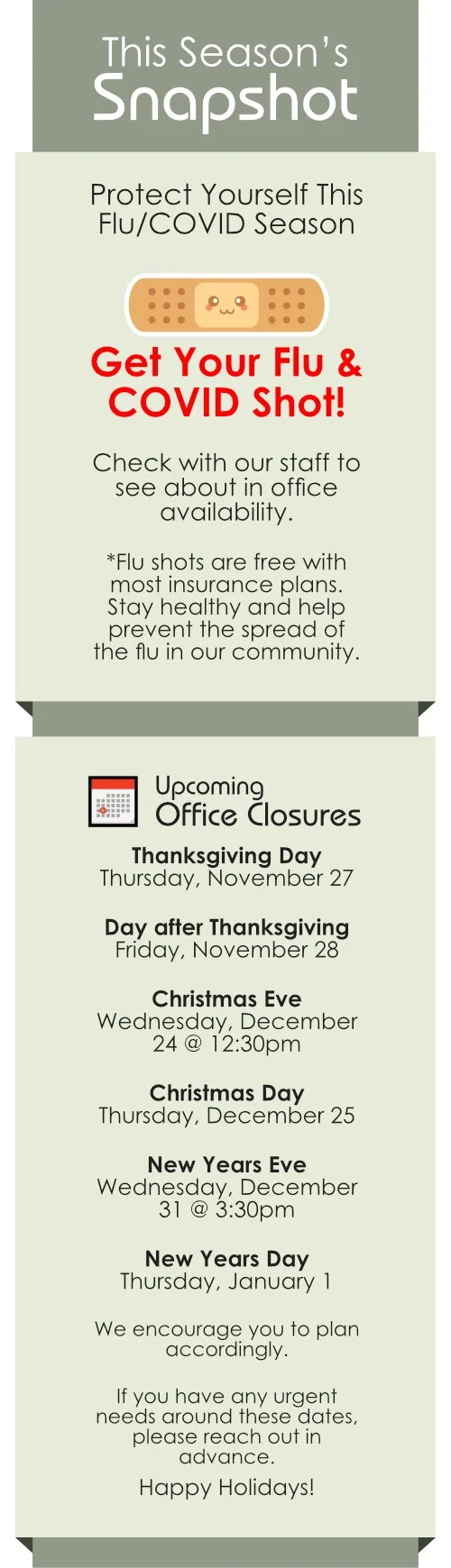 Flu season is in full swing! Make sure you and your loved ones are current on flu shots, COVID boosters, and other recommended vaccines.